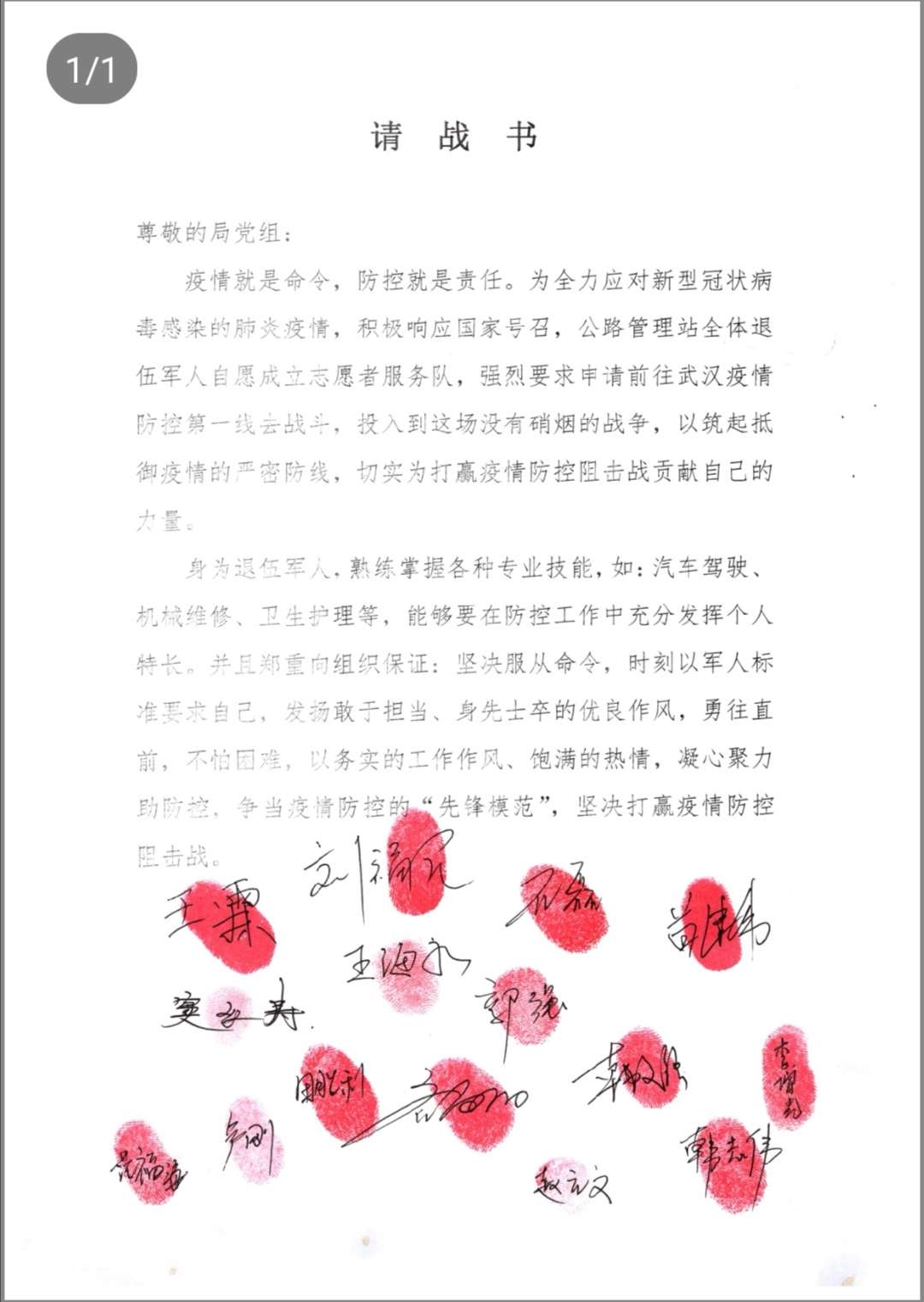 公路管理站站长刘福民是一名退役军人,多年的军旅生涯造就了他雷厉风行的性格,面对疫情,他主动要求到武汉疫情防控一线执行任务。在他的激励带动下,该站熟练掌握汽车驾驶、机械维修及卫生护理技能的15名退役军人踊跃报名,自发成立了志愿者服务队,向局党组递交了请战书,随时听从党和人民的召唤,时刻准备重返战斗一线,奔赴武汉疫区去进行志愿服务,为打赢疫情防控阻击战做出昌黎交通人应有的贡献。