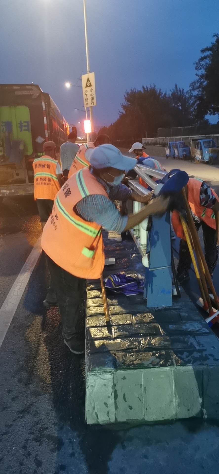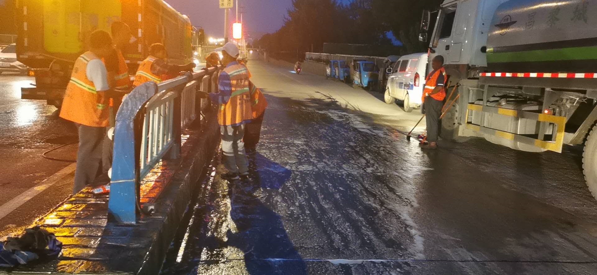 为给市民营造良好的出行环境,保障强降雨后护栏洁净,县城管执法局安排4辆环卫保洁车辆,组织15名环卫保洁人员对东外环路段主路和辅路护栏进行了清洗保洁。清洗过程中,环卫保洁人员用抹布对护栏进行擦拭。同时,动用两台湿扫车对路面进行清扫保洁。最终,于晚11:30分完成了对东外环全路段护栏的清洗保洁。