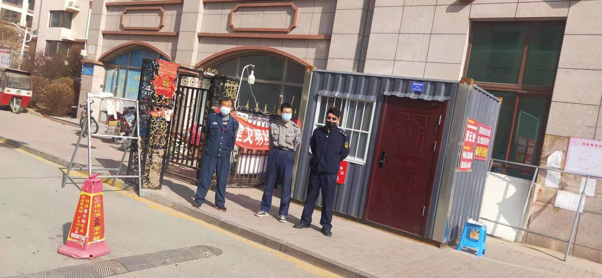 为做好新冠病毒疫情防控工作,给居民提供一个安全、健康的节日环境,县城管执法局党员志愿者春节不休息,在金泽茗园、兴龙银座、富贵家园、碣石美域小区防控检查点,坚守在疫情防控一线的岗位上。每名志愿者发挥吃亏耐劳、认真负责的精神,在做好自我防护的同时,不畏寒冷,认真对每名小区出入人员进行体温测量,对外来人员做好检测和人员登记,并利用宣传条幅、播放音频等方式,向小区居民宣传防控知识,使广大居民科学防范,积极投入到此次病毒防控中。