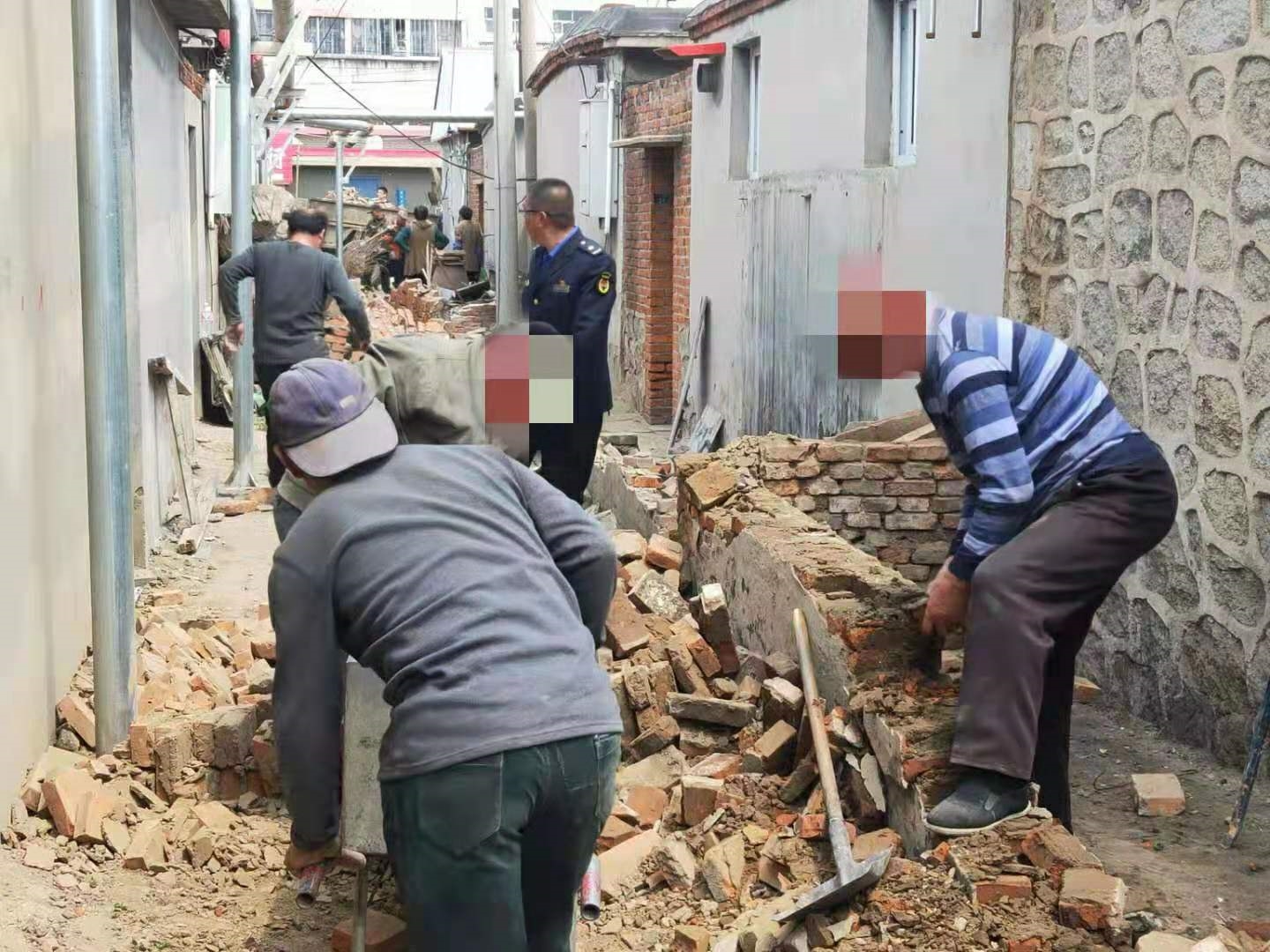 二街卫校东侧违章棚亭属于历史遗留问题,已经影响了周边居民出行。为改善周边居民的居住环境,县城管执法局对上述违章棚亭下达了限期拆除通知书,要求限期拆除,同时,向居民讲明相关利害。此项举措得到了周边居民的支持和理解,均表示自拆。针对居民缺少人员与工具的情况,城管执法局工作人员主动帮拆。2021年5月13日,县城管执法局组织20余人、安排车辆3辆并携带工具,帮助居民对违章棚亭进行了拆除,并将建筑垃圾清运干净。此次行动,共计拆除违章棚亭6处,40余平方米。有效提升周边居民的生活环境。