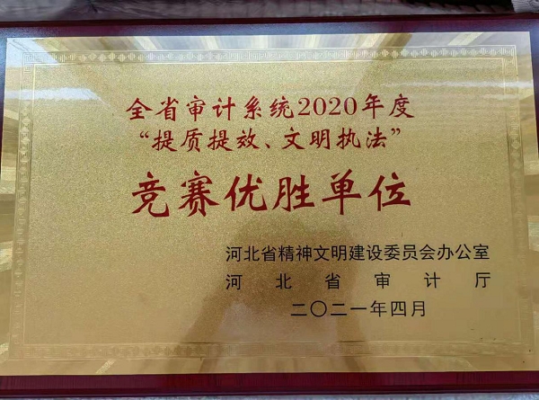 2020年河北省审计厅重点围绕 "审计促进高质量发展攻坚年" 活动和审计整改监督、内部审计、审计信息宣传等工作积极开展了 "提质提效、文明执法" 竞赛。昌黎县审计局在此次活动中荣获竞赛优胜单位。这是对我局审计工作的肯定,在今后的工作中昌黎县审计局将立足新发展阶段审计工作面临的新任务新要求,不断加强社会主义精神文明建设,依法全面履行审计职责,努力提高审计监督效能和审计工作水平,奋力开创我县审计工作新局面,为我县 "十四五" 发展开好局、起好步提供坚强审计保障。