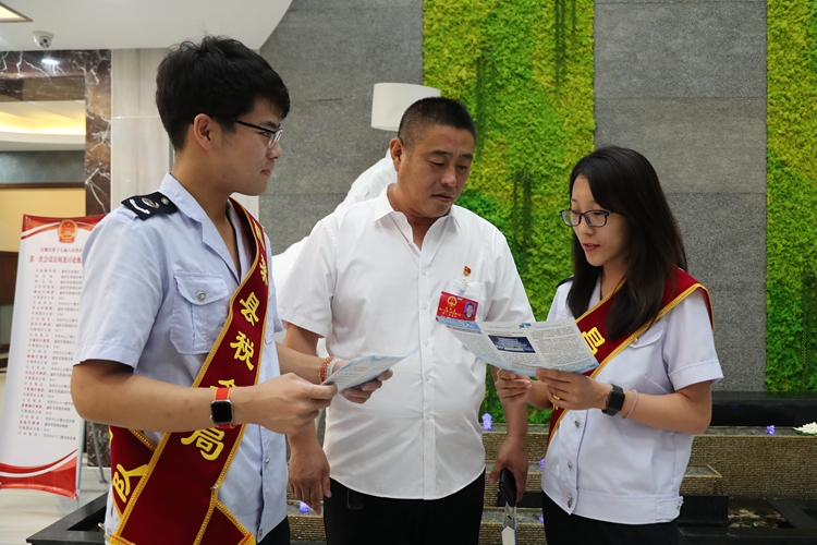 图为税务干部为县人大代表何继宏宣讲税收政策