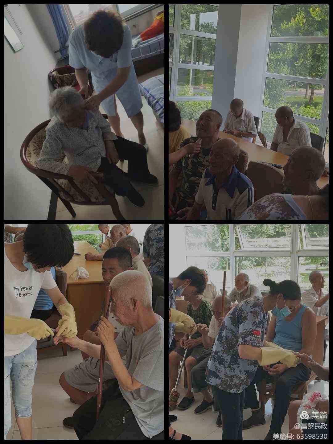 安抚老人,为老人们刮胡子、剪指甲,清理个人卫生,给老人们家的温暖、亲人般的呵护。