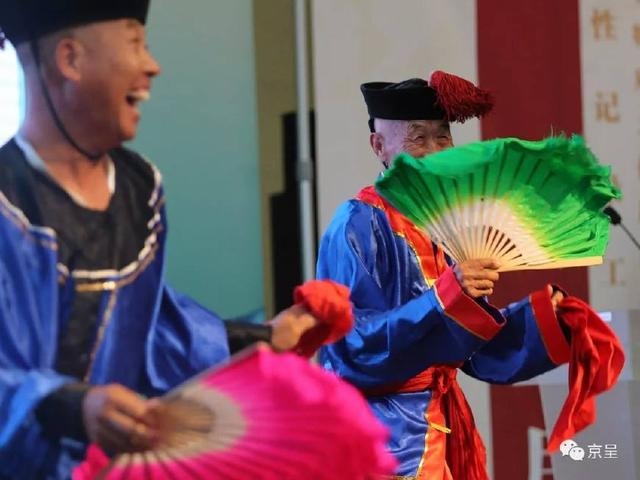 推介会上,伴随着喜庆的大杆喇叭音乐的响起,80岁高龄的秦梦雨老师携弟子杨常青一亮相,扇子、手绢一转动,全场便响起热烈的掌声。这位国家级非遗项目 "昌黎地秧歌" 国家级传承人,仅仅用了几分钟的时间,就用精湛的技艺征服了全场,把幽默诙谐与欢乐,传递给了每一位观众。一个动作从头到肩,从肩到腰,从腰到腿,从腿到脚,都行云流水;裘帽、手帕、扇子,三种道具运用自如......秦梦雨和徒弟把昌黎地秧歌鲜明的舞蹈风格展现得淋漓尽致,座无虚席的国家图书馆学津堂报告厅掌声雷动,全场观众无不为80岁高龄的秦老师而惊叹,掌声、欢笑声贯穿整段表演。活动结束后,很多观众追随秦老师,与其合影留念,