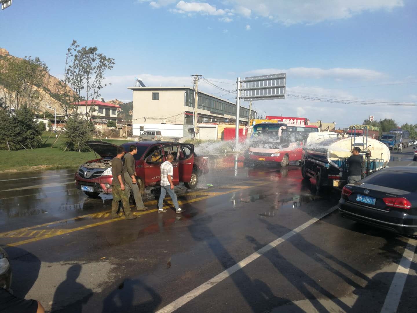 9月6日下午四点二十分,一辆轿车在国道205与卢昌线路口突然发生自燃,昌黎县交通运输局公路养护人员正在卢昌线洒水作业,发现险情后,第一时间驾驶洒水车赶到救火,经过近10分钟的将大火扑灭,避免了更大事故的发生。
