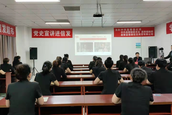 10月30日晚6时30分,昌黎镇宣传部携手信发商厦共同举办 "党史宣讲进企业" 活动。县委党史专家宣讲团成员、县纪委梁波同志百忙中利用双休日时间走进信发商厦进行党史宣讲。本次活动严格按照我县疫情防控要求,参训员工14天以上无外出史,全程佩戴口罩,人数控制在30人以内,全部完成二针及以上疫苗接种,活动受到了与会员工的热烈欢迎和好评。