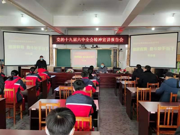 12月24日,龙家店镇党委书记钱连喜走进镇中学,开展了以 "强国有我奋斗始于当下" 为主题的党的十九届六中全会精神宣讲活动。钱书记结合龙家店镇工作实际和教育工作情况,向大家充分讲解了《中共中央关于党的百年奋斗重大成就和历史经验的决议》的精华内容,并勉励教育工作者进一步增强做好教育工作的责任感,要把群众的期盼作为工作的方向和动力,满足人民对优质教育的强烈需求,以高水平的教育支撑经济社会的高质量发展。鼓励同学们以昌黎人民的骄傲国家最高科学技术奖王大中、新晋当选中国科学院院士的陈光为榜样,奋发向上、精学报国。镇副书记冷永江、镇中心校校长郭洪兴、镇中学师生代表共计42人参加。