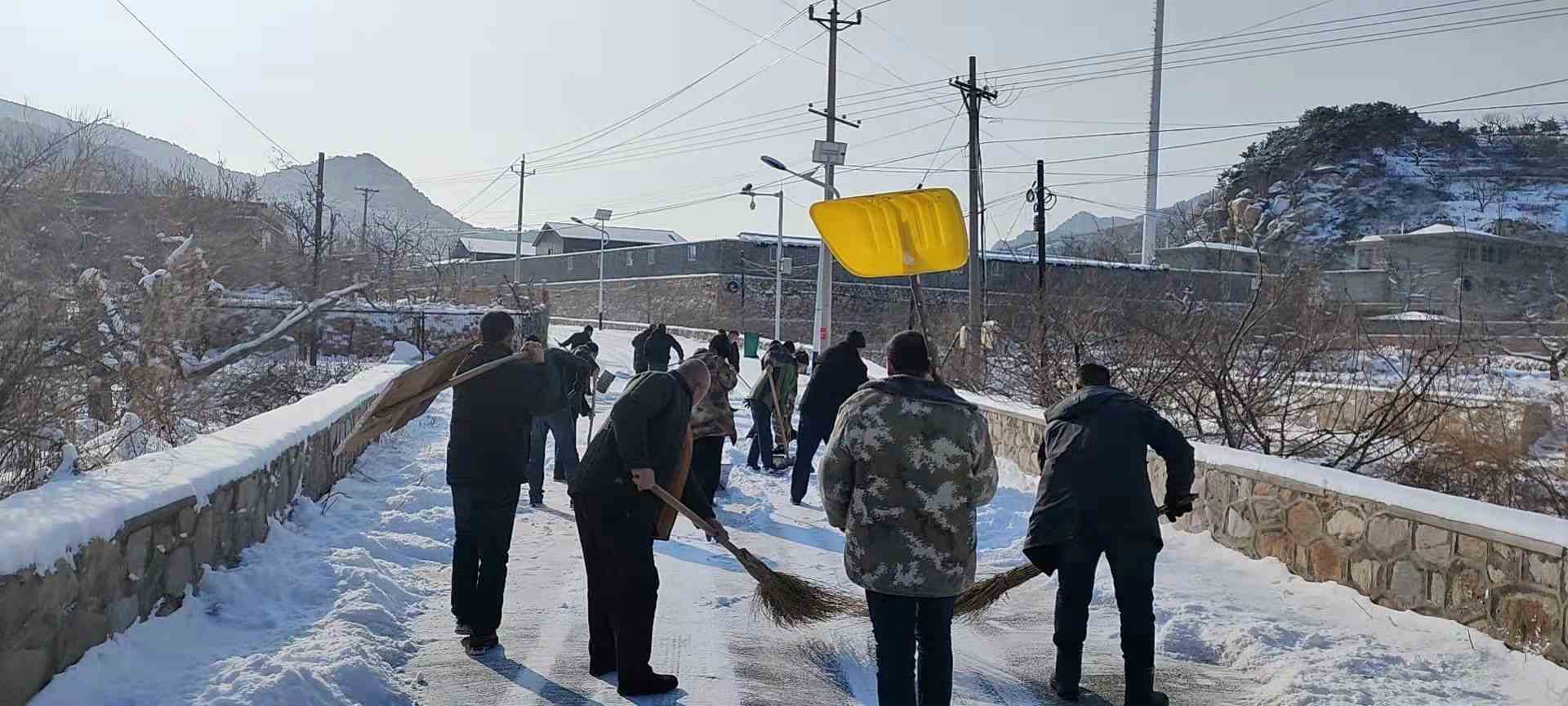 村书记、村两委成员、村民代表、党员干部、志愿者、群众也纷纷投入到清理积雪的队伍当中,利用铲车、锹、扫把等工具,对村内积雪路段进行清理。
