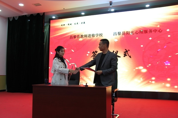 上午9点08分,进修学校校长龙江平、阳光心理服务中心杨莹分别代表双方在《昌黎县心理健康专业教师培训项目合作协议书》上签字,标志着新的合作正式启动。本次培训课程由昌黎县阳光心理服务中心承办,对心理教师进行专业培训与指导。培训时间为