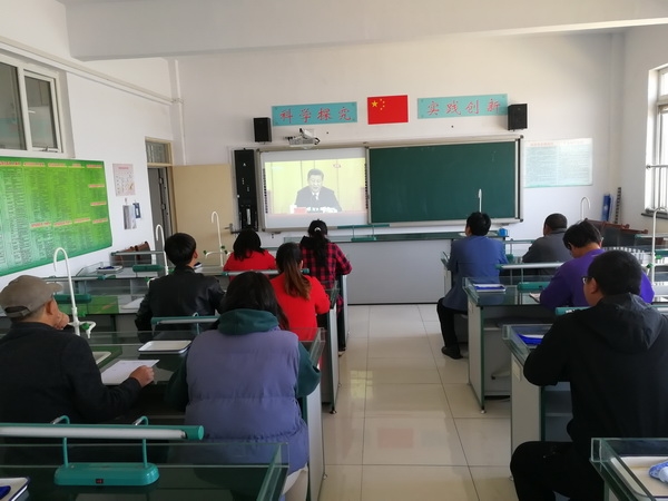 2019年4月30日上午十点,大滩完全小学党支部全体党员集中在二楼实验室,观看庆祝 "五四运动一百周年" 活动视频,大滩小学支部书记孙继文主持观看活动。在庆祝大会上,习近平主席做了重要讲话,观看视频的党员同志们用心倾听,认真做好记录。