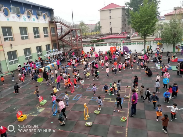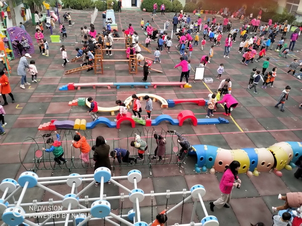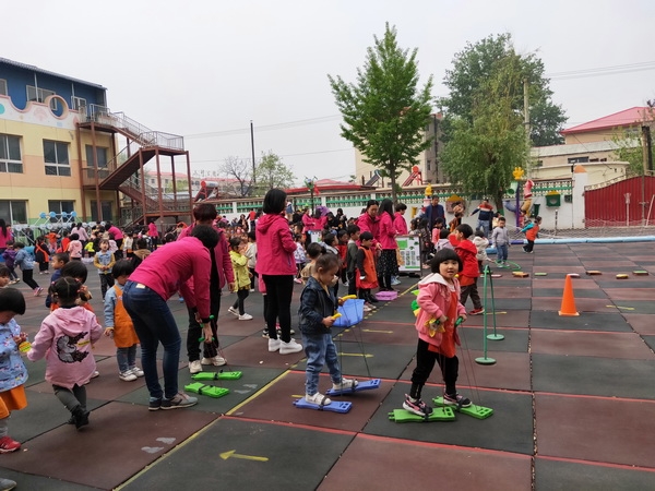 四月二十九日上午,微风不燥,阳光正好。昌黎县幼儿园全体师幼及家长志愿者齐聚操场一起感受春天,迎接昌黎县教师发展中心梁玉婷、王静两位研修员对运动型区域活动的评比活动。