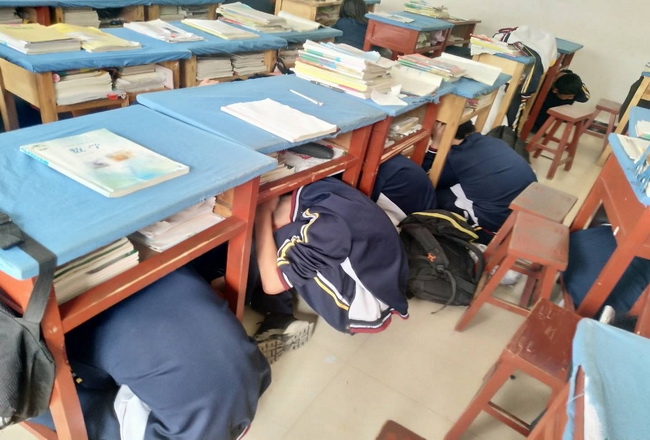 9点50分,随着紧急预令的发出,同学们双手抱头或用书包护头很快藏于课桌底下,进行室内应急避震。当警报声第二次响起,,在班主任的组织带领下,所有学生双手交叉护住头部,按照逃生演练方案设定的逃生路线,快速、有序地撤离到学校操场上。在紧急疏散演练过程中,学生快而不乱,急而不抢,做到了安全、迅速、有序。集合完成后,盛汝强主任点评演练过程中存在的问题,进一步强化学生安全避震逃生基本技能和基本技巧。