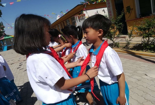 少先队入队仪式已《出旗曲》开始,少先队员行队礼,唱《我们是共产主义接班人》,紧接着辅导员宣讲队名、队的领导者和入队的目的,应知道红领巾、队旗、队徽、队礼、呼号及其意义。之后宣布新队员姓名及由高年级授红领巾、授中队旗。最后由闫校长致辞并退旗敬礼!