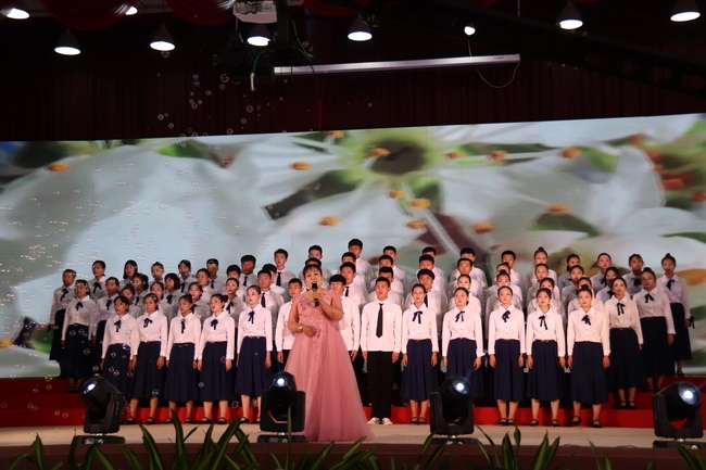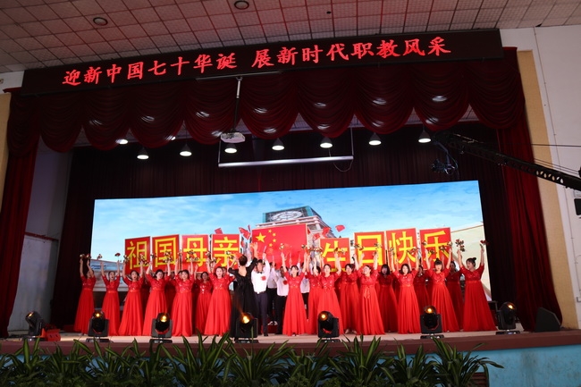 舞蹈《爱国之恋》、合唱《红歌联唱》将节目展示环节推向高潮,伴随着《我和我的祖国》歌声响起,在场嘉宾和师生爱国之情溢于言表,自发的全体起立,挥动手中的五星红旗大声合唱。昌黎职教人用热情的舞蹈、嘹亮的歌喉、精湛的技艺向伟大的祖国致敬、向新中国七十华诞献礼。