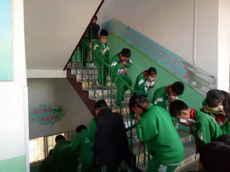 上午9:40,随着急促的警报响起,各位老师立即到达指定岗位,引导楼内学生快速疏散。各位班主任带领学生用毛巾捂住口鼻,弯腰从教室按规定路线撤离;各楼层导护教师在楼梯拐角处协助学生撤离;学生们做出正确逃生姿势,沿着学校指定路线有序地到达操场安全地带。整个撤离过程中,学生基本做到动作规范,行动迅速,不拥挤不慌乱,整个撤离时间在1分27秒之内完成。