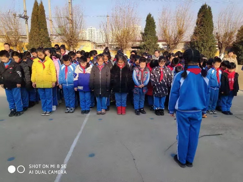上午10:00何家庄小学的全体师生齐聚操场,为在南京大屠杀中的遇难同胞默哀。