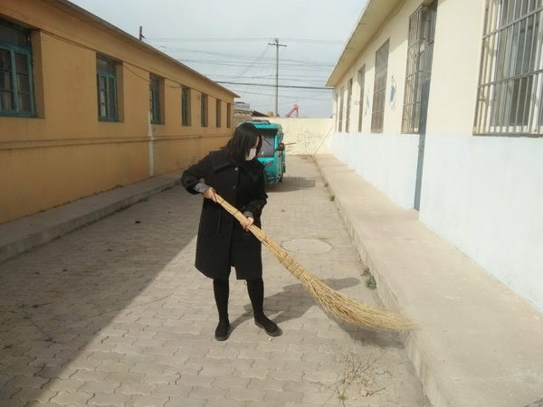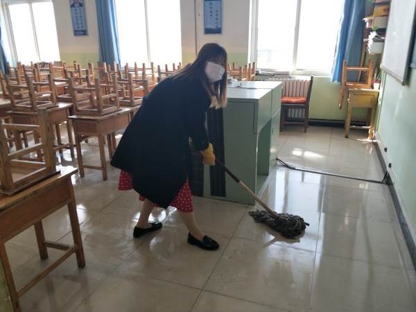 从3月23日至4月9日,冯涛校长每天提前一天,对带班领导和值班教师做出具体工作安排,打扫教学楼内、操场、厕所、花园及幼儿园各处的卫生,历时18天,冯涛校长身体力行,带头参加劳动,清除了所有卫生死角,为学生复学创造了一个优美、洁净的校园。