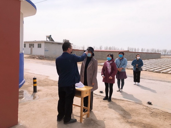 【场景一】 入校检查。大门口摆放两张桌子,一边何志强主任负责测温登记、一边贺玉林主任负责测温登记。其他教师模拟学生,间隔一米排队,等候检测入校,分别从东、西、南三个入口进入教学楼。
