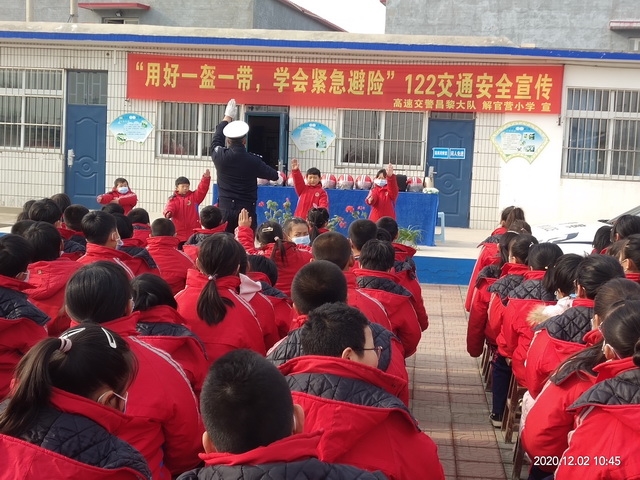 为了营造安全、有序、文明的校园周边交通环境,增强师生交通安全意识,提高自我保护能力。 2020年12月2日上午,解官营完全小学特邀高速交警昌黎支大队的杨警官等人来校,为全校师生开展了以 "用好一盔一带,学会紧急避险" 为主题的交通安全知识讲座。