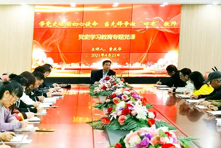 4月23日下午,县委教育工委书记、县教育体育局党组书记、局长曹庆华在昌黎三中会议室,以《学党史砥砺初心使命当先锋争做“四有”教师》为主题上党史学习教育专题党课。昌黎三中全体班子成员和党员教师60余人聆听了党课。
