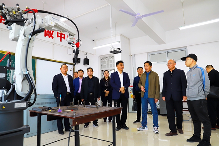 考察团一行首先实地察看了学校机器人实训室和PLC实训室,校长赵利军介绍了学校机加工、机器人等专业的教学设施、师资水平。随后在知行楼会议室孟局长主持了校企座谈会,会上,赵校长介绍了学校的办学特色、专业设置、发展思路、远景目标等,广东智通人才连锁集团副总裁李纲领介绍了集团公司基本情况,智汇自动化常务副总李向阳介绍了校企合作思路。双方就校企合作、产教融合展开座谈交流。