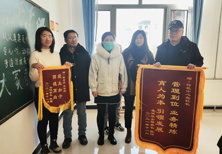 11月25日,昌黎县特殊教育中心收到了一份特别的 "礼物" ,那就是春雨班的家长们为学校及教师们送来了锦旗,表达心中的感激之情。特教中心校长赵民胜代表学校全体教师接过锦旗并表示感谢,他说这不仅仅是一面旗帜,更是家长对学校及老师们工作的肯定,同时强调学校教师一直会保持初心,为了孩子而努力奋斗,也希望家长继续支持学校工作,一起为孩子的美好明天加油喝彩!