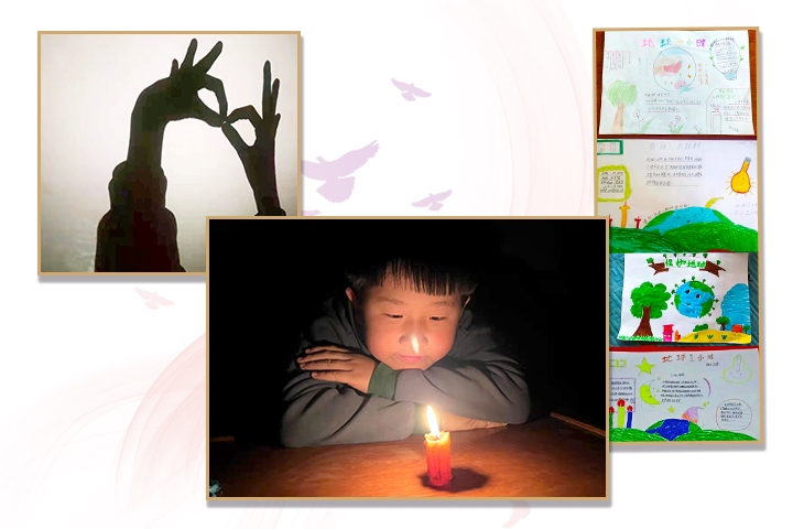 2022年3月26日晚上8:30-9:30期间,同学们纷纷拔掉手机充电器,熄灭家庭公共部位的景观照明灯,走下网络、走向室外、亲近自然,感受黑夜的魅力。有趣的手影游戏,在黑暗中光与影的相遇,创造出了别样的美丽。
