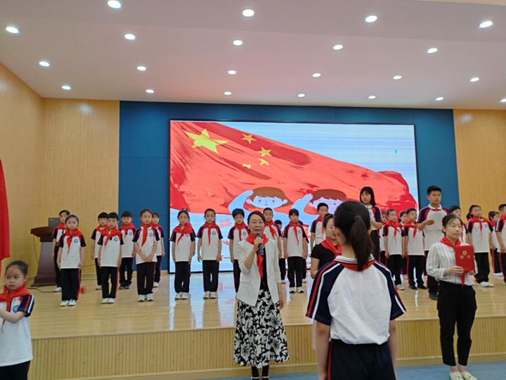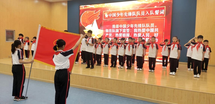 告别温柔的春风,迎来争艳的百花;告别春光灿烂的五月,迎来花香浓馥的六月。一年一度的 "入队仪式" 在孩子们的期盼中如约而至。5月31日,昌黎县宏兴实验小学在多功能厅为一年级的学生举办新队员入队仪式。少先队新队员入队仪式在雄壮有力的出旗曲中拉开序幕,大队辅导员朱晔老师宣读新队员入队决定。五年级的老队员为新队员授红领巾,并为各中队授中队旗,大队委员为一年级各中队辅导员佩戴红领巾,袁静涛校长为各中队辅导员颁发聘书,并激励少先队员们以一名少先队员的标准严格要求自己,努力学习,热爱劳动,做党的合格接班人!看着鲜红的红领巾在自己的胸前飘扬,孩子们脸上不由得洋溢起开心自豪的笑容。在鲜艳的队旗下,新队员高举右拳,跟着大队长庄严宣誓。最后,少先队辅导员老师带领队员们呼号,入队仪式在队员们 "时刻准备着" 的呼号声中圆满结束。