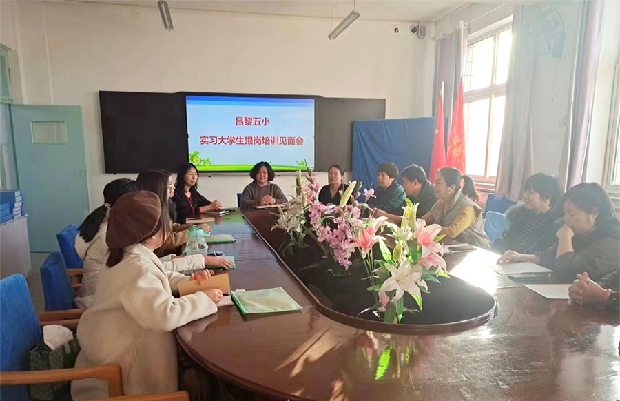 2022年2月14日,昌黎五小举行了 "实习大学生跟岗培训见面会" 。见面会由齐建侠主任主持,她向实习生介绍了学校领导和跟岗导师,并对实习生提出要求,希望她们积极听课评课、参与班级管理、参加学科教研活动等。会上刘娜校长对实习生表示热烈的欢迎,刘校长指出学校非常重视本次活动,学校在时间紧张的情况下确定跟岗班级和导师,连夜制定了学校和导师的跟岗培训计划,最后希望导师和实习生按计划开展各项活动,实习生们在实习期间能俯身求知,虚心求教,学有所得,为将来走向工作岗位做好充分准备。欢迎仪式在掌声中圆满结束。
