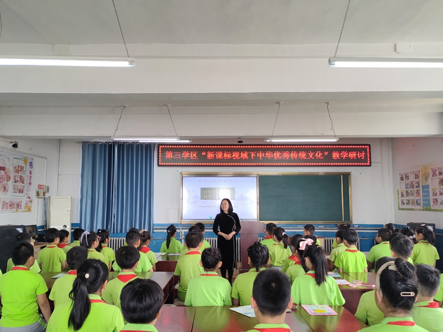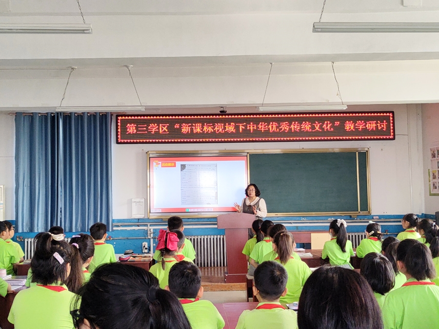 县直三学区副校长秦瑜主持活动。首先由一小的才爽和刘丽两位老师分别讲授了统编小学语文三年级下册第三单元的综合性学习《中华传统节日》习作和第三单元 "中华传统文化" 单元整理课。才爽老师在习作指导中注重落实语文要素,巧妙地把课文中学到的写作方法迁移到写作之中,做到课文与习作融会贯通,教学效果良好。刘丽老师的单元整理课体现了以生为本的理念,学生表现精彩,活动紧扣 "中华传统文化" 这一主题,有效落实了 "文化自信" 这一语文核心素养。