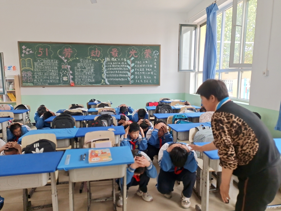 学校根据实际情况,认真细致的制定此次演练活动方案,下午3点50分演练正式开始,班主任们引导学生,其他教师按照演练计划各就各位,各司其职。当第一次警报声响起时,班主任组织学生在课桌下短暂躲避。当疏散报警信号响起时,全体学生立即护着头,按照老师的指示,迅速有序地撤离。全校师生有序高效的来到操场,到达指定地点后,王蕴慧校长亲自带领各班主任及时检查撤离情况,并盘点人数以确保每个孩子安全地撤离到指定位置,保障了本次演练活动的顺利进行。