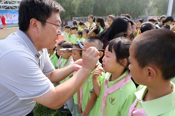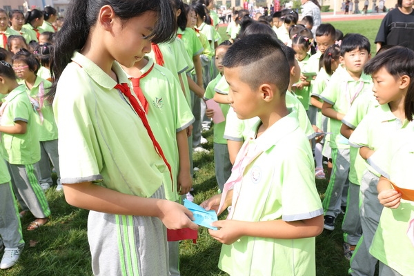 学校依托 "八彩教育" 开展德育活动,小导师结对交流活动本学期继续开展。八彩中的粉色代表礼仪,各班级评选出的明星少年作为小导师与新同学结对,颁授粉领巾,在今后的生活、学习上给予帮助,为孩子们树礼,从此礼貌待人。新同学们自正衣冠,后明事理。古人云:冠必正,纽必洁、衣贵洁、不贵华,这足以说明了古人对正衣冠的重视。在悠扬的古典音乐中,老师们用朱砂给学生们启智,破笔开蒙。用朱砂点红痣,意为开启智慧,能够从此眼明心亮,发奋读书,以此寄托美好的愿望。接着全体同学行拜师礼。感谢老师教我读书、感激老师教我做人、感恩老师永生不忘。孩子们稚嫩的童声让人感受到了天真无邪,却充满了信心和勇气。