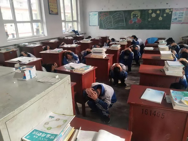 上午9时50分随着 "新集镇中学避震应急疏散演练开始" ,全体教师立即到达指定岗位,全体学生立即寻找安全位置抱头下蹲避险,然后在教师的指挥下有序疏散到操场中心后,各班班长立即查点人数并向班主任报告,再由班主任报告给总指挥,最后校长做了活动总结,对演练给予了肯定,并指出了存在的问题,提出了更高的要求,使大家时时刻刻绷紧安全这根弦,安全重于泰山。