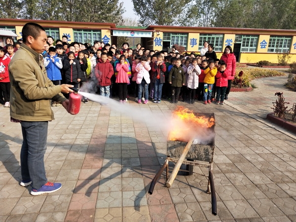 此次消防宣传日专项教育活动分三个环节进行:一、观看消防安全专题片。各班级学生在班主任老师的组织下,利用多媒体观看消防安全专题片,一起学习消防安全常识。二、消防安全疏散演练。疏散演练前,各班班主任就演练时应注意的事项向学生们作了详细讲解,还重点向学生们讲解了火灾来临时应该如何正确应对、如何正确疏散等基本常识。在三声急促的 "警报" 响起后,各班学生在班主任老师的组织下,迅速降低重心,捂住口鼻,从教室内有序迅速撤离,班主任进行现场指导,纠正学生出现的不正确动作和姿势。各年级学生迅速有序地疏散到了指定 "安全地带" 后,各班级班长清点人数并向老师汇报。整个演练过程紧张有序,仅用了两分多钟,演练达到了预期的效果。三、学习灭火器的使用。胡志利老师向全体师生详细讲解了灭火器的使用方法,并进行了现场演示,随后找高年级同学进行尝试,给所有师生留下了深刻的印象。