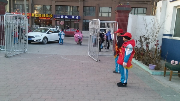 12月27日,天气骤然降温,但在第四完全小学的校园门口两名红领巾监督员同学仍然坚守在自己的岗位上,戴着臂章和小红帽,肩上披着写有 "红领巾监督员" 的绶带,用亲和的语言向大家提醒文明用语、注意安全,向进入校园的老师鞠躬问好,同时检查进入校门的学生是否校服穿戴整齐,是否正确佩戴了红领巾,发现带入玩具或零食的学生也会进行警告说明,同时按照规定进行处理。他们在实践中不断自我教育、自我提高,认认真真,一丝不苟,播下了文明行为的种子,形成了一道独特的校园文明风景线,受到了老师与同学们的好评。