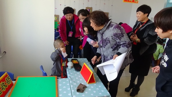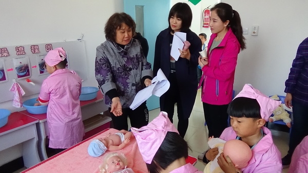 调研内容以角色游戏混龄活动为重点,兼顾班级个别化学习活动和户外运动游戏混龄活动。调研过程首先听取了关于提高区域活动质量,在内涵发展方面所采取的策略汇报,汇报中提出: "幼儿的学习是在游戏和日常生活中进行的" ,基于此精神,昌黎县幼儿园本着 "走近幼儿,让儿童做游戏的主人" 的宗旨,充分利用资金、场地、师资等多方面的条件,为孩子们创造了可供自主选择、自主游戏、自主学习的区域活动环境,其中包括学习型区域活动以及 "大带小" 的户外混龄区域活动和角色混龄区域活动。汇报完毕后李素英主任一行进入角色混龄活动区 "碣石小城" 观察、参与幼儿的游戏活动并给予老师现场建议和指导。随后,察看了幼儿园研究区域活动质量提升,促进内涵发展的教研记录及教师对区域活动的观察记录并与教师们进行了针对区域活动开展存在的问题及内涵发展方面的交流研讨,从思想和实践方面给老师们以点拨、提升。